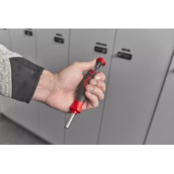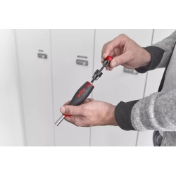 Le rangement d'embouts, intégré dans le manche et sécurisé par un système magnétique, contient huit embouts Standard 1/4" C6.3 utilisables aussi bien avec une visseuse qu’avec un tournevis porte-embout.