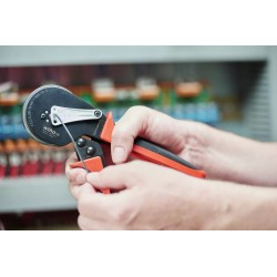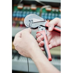 Lors de l'utilisation classique de pinces à sertir, il est possible que les cosses de conducteurs se coincent dans la pince ou qu'elles soient mal serties. La pince à sertir automatique avec sertissage hexagonal permet d'éviter les déchets inutiles de câbles et de cosses de conducteurs. Elle dispose d'une plage de sertissage de 0,08 à 16 mm² et combine donc de manière compacte deux pinces à sertir en une. La pince à sertir couvre ainsi une grande partie des applications. Le sertissage hexagonal permet d'éviter que des petites cosses de conducteurs restent accrochées. Par ailleurs, l'aide de guidage assure une sécurité de processus supplémentaire en empêchant le sertissage de l'enveloppe en matière plastique. Grâce à sa fonction de sertissage automatique, la pince convient aussi bien pour les cosses vides (jusqu'à 16 mm²) que pour les cosses jumelées (jusqu'à 10 mm²). Les poignées en matière plastique élastique et amortissant les chocs garantissent en outre un travail confortable et moins fatigant. Un levier intégré permet d'interrompre manuellement l'opération de sertissage à tout moment.